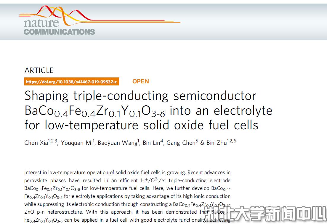近日,必赢官网物理与电子科学学院朱斌教授团队在低温固体氧化物燃料电池电解质方面取得突破性进展,相关研究成果以“Shaping triple-conducting semiconductor BaCo0.4Fe0.4Zr0.1Y0.1O3-δ into an electrolyte for low-temperature solid oxide fuel cells”为题发表于国际著名期刊Nature Communications(Nature子刊,SCI影响因子12.353)。物电学院青年教师夏晨为论文的第一作者,朱斌教授和汪宝元副教授为共同通讯作者,必赢中国官方网站是该论文的第一完成单位和通讯单位。